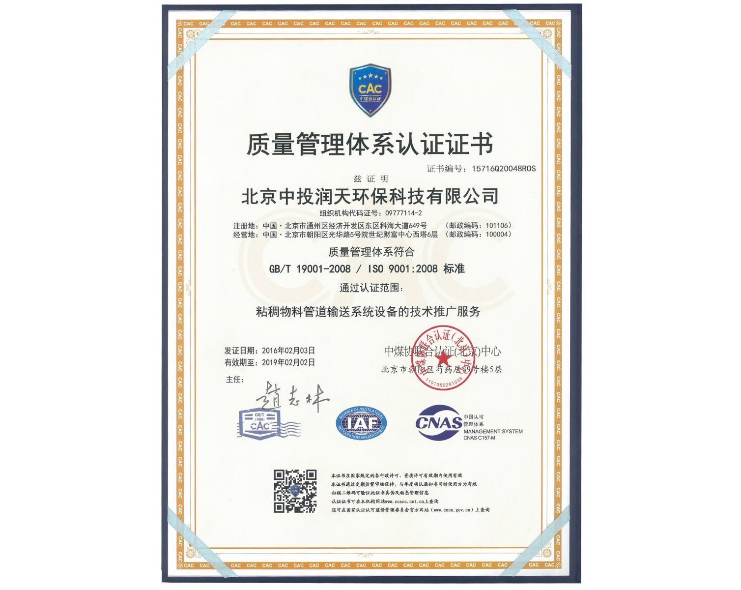 日前,北京中投潤天環保科技有限公司正式取得了北京中煤協質量認證公司頒發的GB/T 19001-2008/ISO 9001:2008質量管理體系認證證書,標志著公司的質量管理體系達到了標準要求,具備提供滿足顧客和適用法律法規要求的粘稠物料管道輸送系統的生產及服務能力。