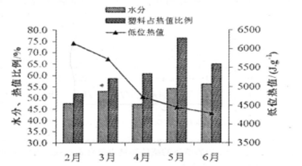 由于我國目前新鮮生活垃圾收集并未真正實施分類、并且存在垃圾桶露天敞口放置、垃圾轉運站設施差別大等客觀條件。因此我國新鮮城市生活垃圾和發達國家相比差別較大。從上海老港填埋廠收集的新鮮生活數據來看,首先,垃圾成分隨機波動大,僅看塑料占比,2月份占比最低約50%。5月份占比最高約75%。其次,垃圾含水率隨季節波動大,冬季含水率最低可達47 % ,夏季含水率最高可至56 % ,受降雨量影響明顯。另外,新鮮生活垃圾的低位熱值波動大,冬季熱值最高可達6200KJ/kg,夏季熱值最低可至4200KJ/kg。