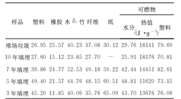 從上海老港生活垃圾填埋場陳舊生活垃圾可以看出以下特點:首先,垃圾填埋3年就已經不含廚余成分,幾乎沒有臭味。其次,垃圾填埋3年熱值可達13000 KJ/kg,填埋10年熱值可達17000 KJ/kg。第三,陳舊垃圾挖出后,篩分分選時物料外水會急劇蒸發,無需干燥設備。填埋10年垃圾分選后含水率可從25%下降到15%,是優質替代燃料。